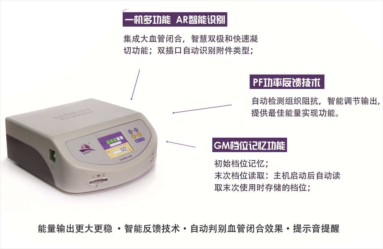 PF power feedback technology: according to different tissues, the host provides different energies after feedback; automatically detect tissue impedance;